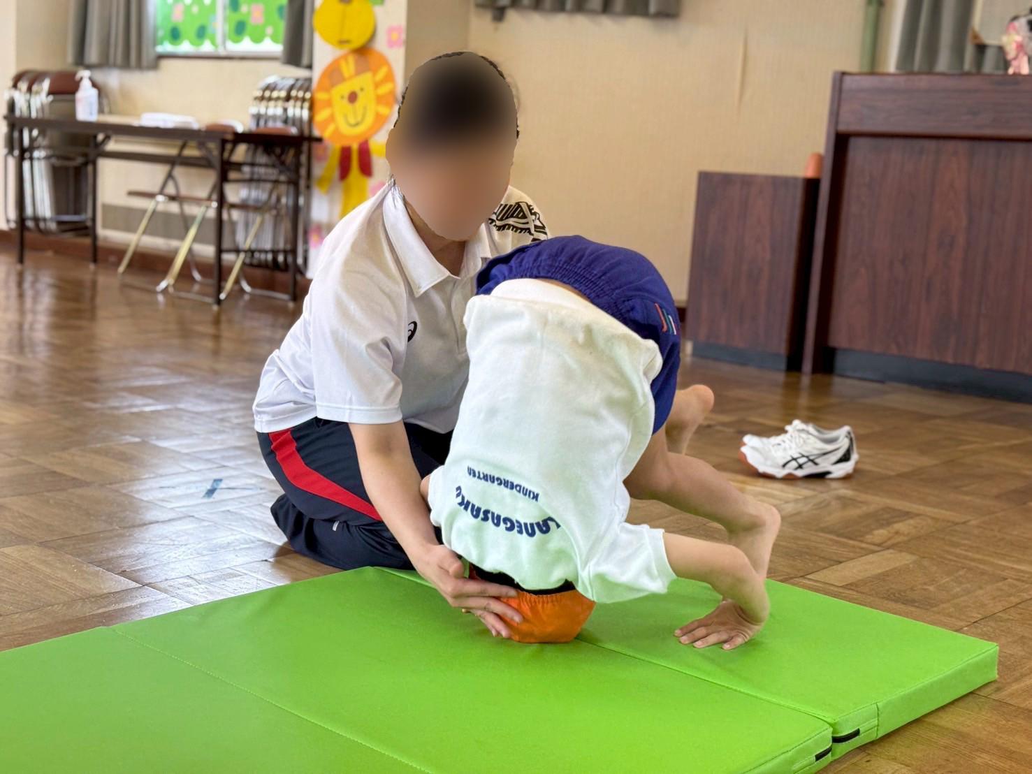 月に3回ほど体操教室『エルステップス』の先生にお越しいただいて、マット運動やダンス等、様々な運動を行っています。基礎体力の向上や、基本的な運動動作の習得とともに、体を動かす楽しみを学んでいくのが狙いです。