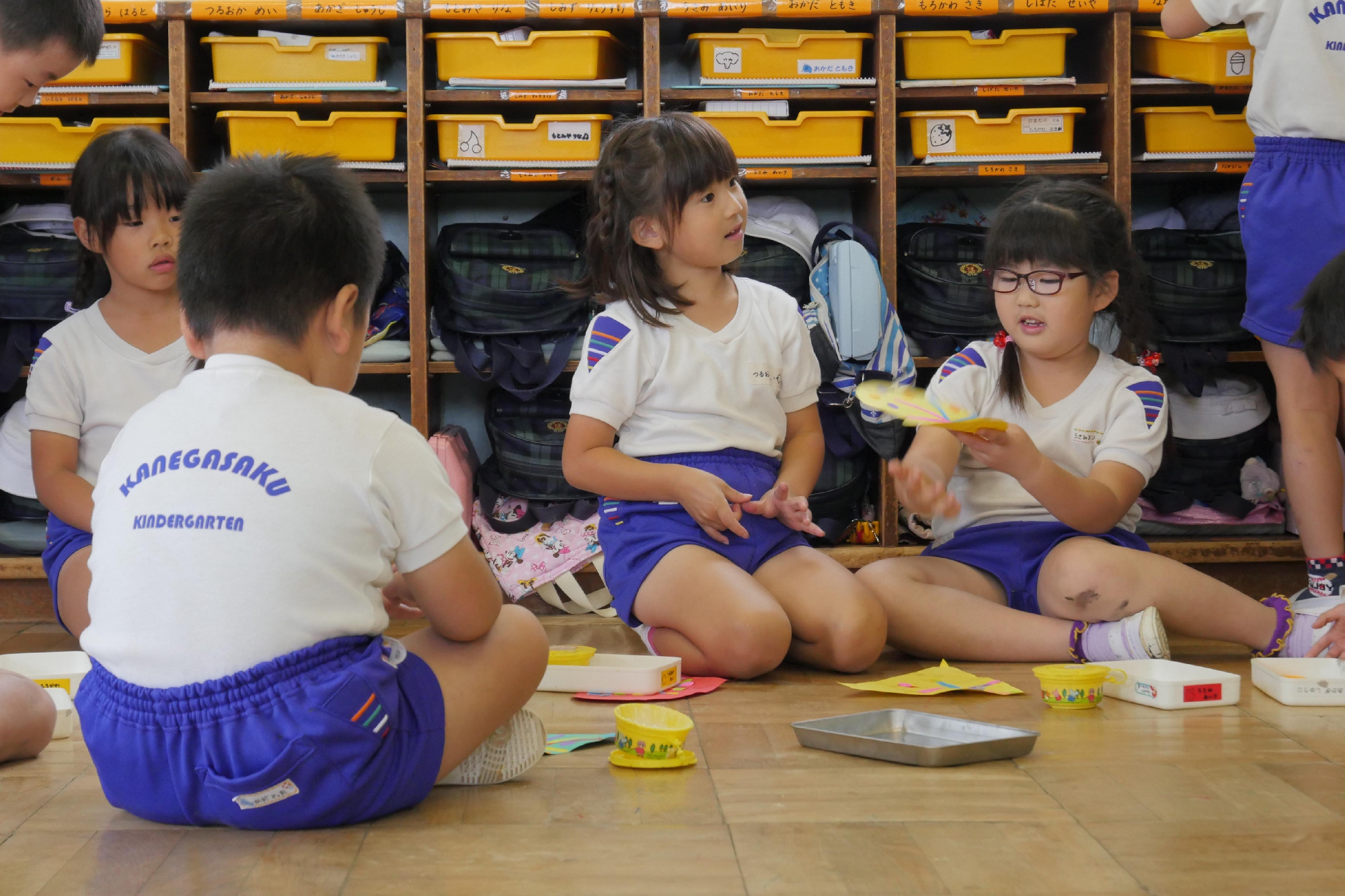 決まりきった玩具を使ったり、点線に沿って折ったり、貼ったり、切ったりした作品を作るのではなく、多少いびつでも子どもが円を描いて、それを切りぬいたり、星を書いてそれに色を塗ったり、和紙を染めてから折り紙にしたりと、子どもの手と頭をたっぷりと使った造形活動から、既成のものを越える想像力や創造性を育てています。