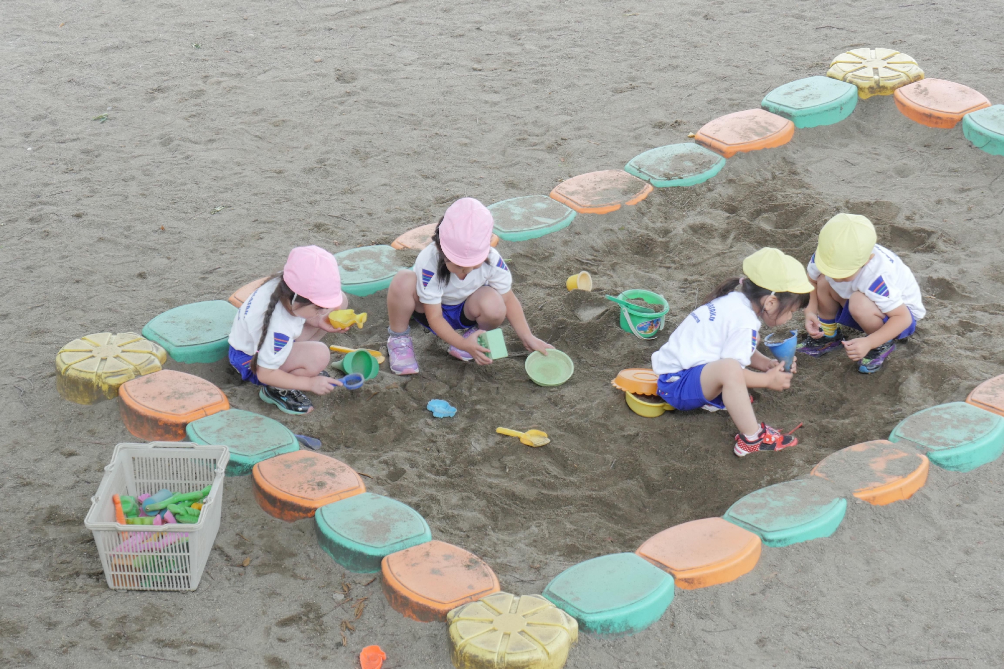 春は草花をつんで遊び、夏ははだしになってドロンコ遊び、木の根を掘ればクワガタがみつかることも。秋にはどんぐりや木の枝を拾って砂場のケーキ屋さんごっこと、園庭の自然と触れ合い健康な心と体を養います。