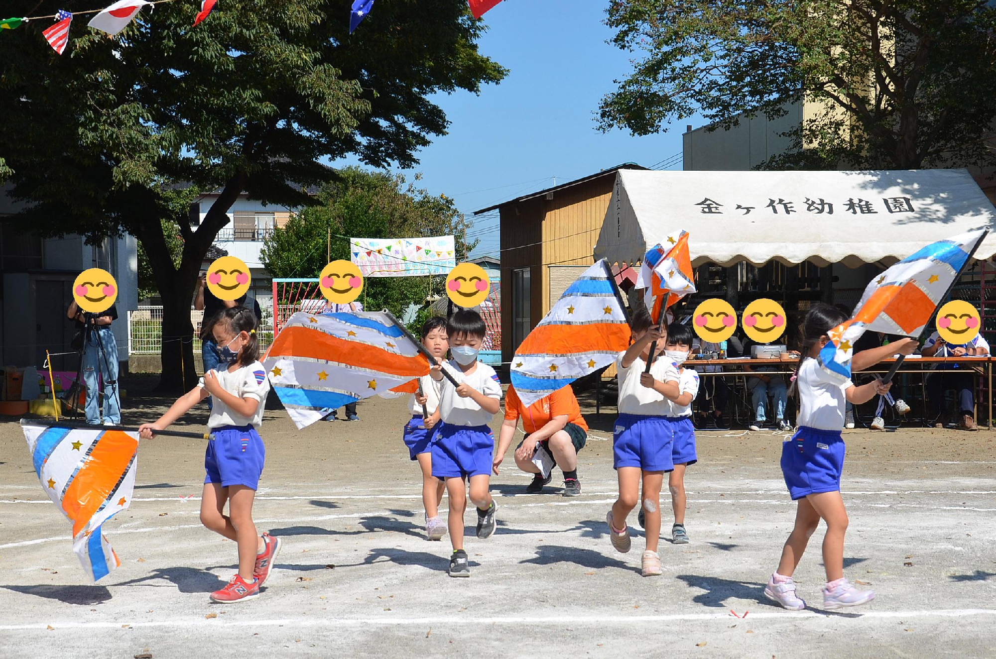 年長組の演技、『フラッグ』です。色とりどりのフラッグを手に旗が風になびいて、とても綺麗です。