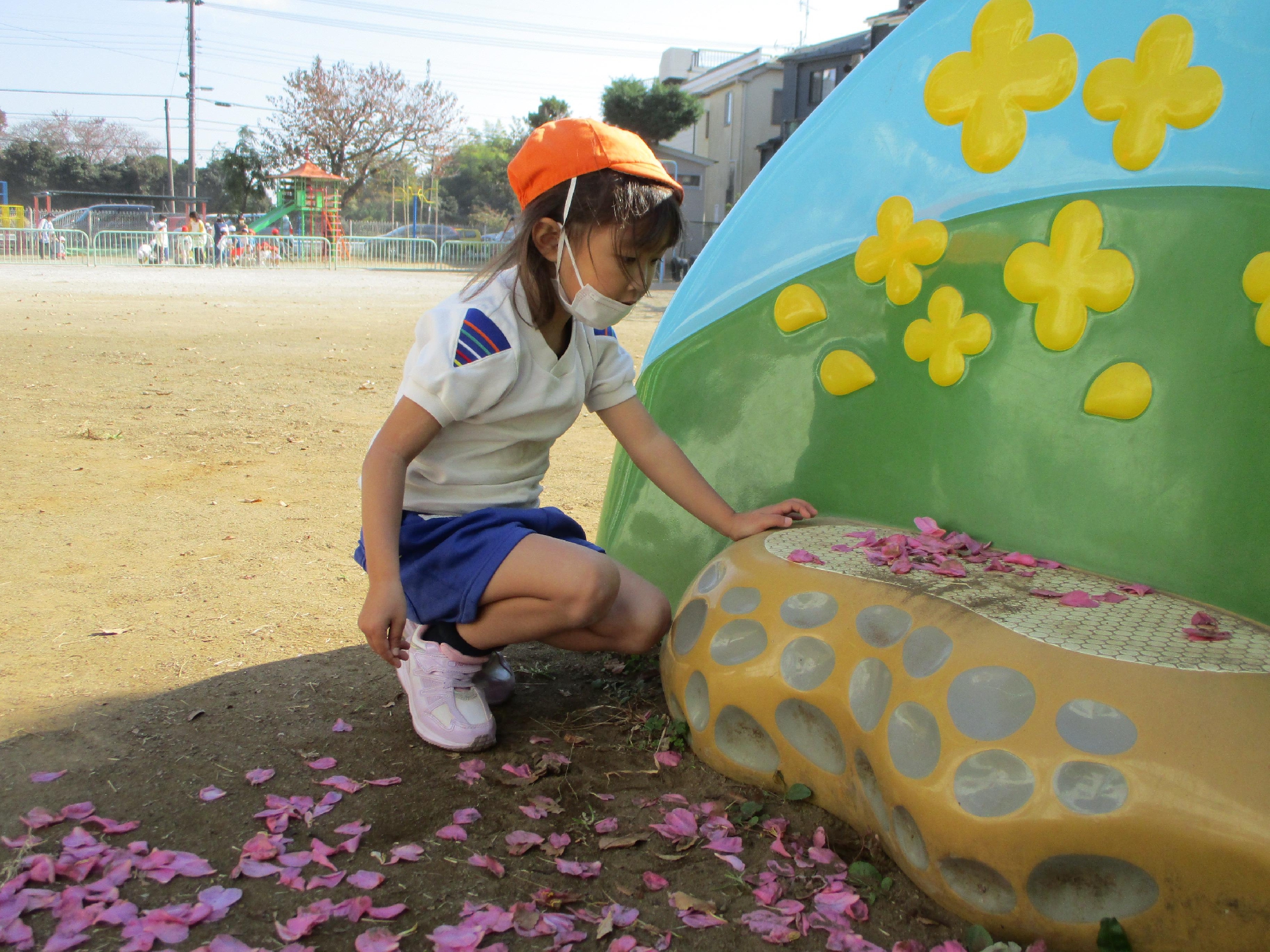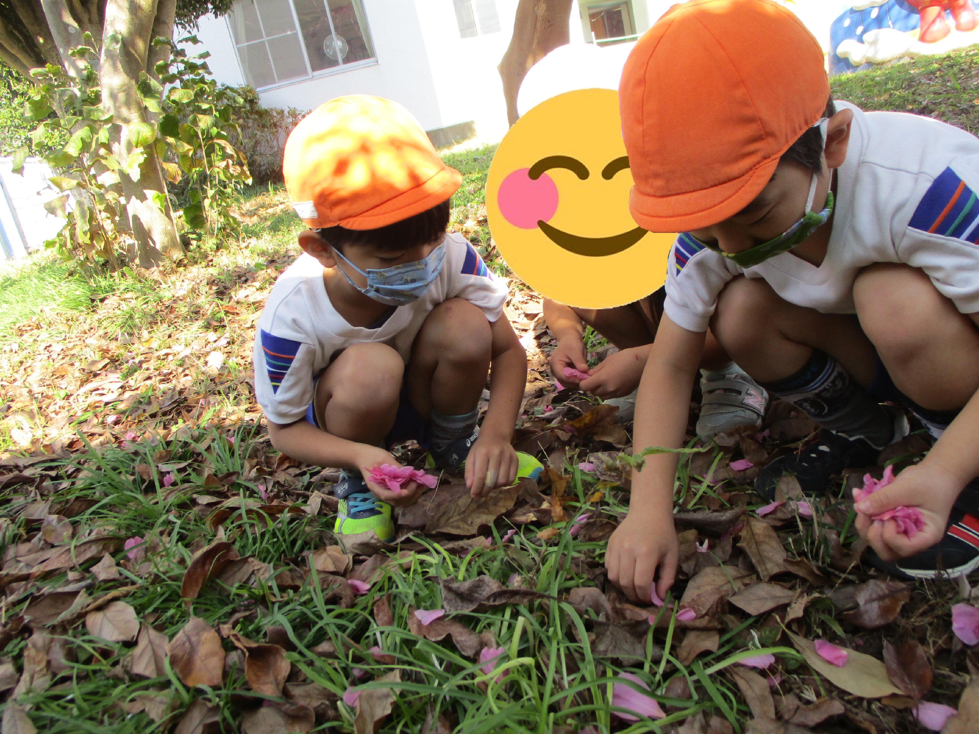 子ども達は綺麗な花びらを一生懸命に集めています。手のひらいっぱいの花びらですが、沢山集まると一つの綺麗な寒椿の花に見えます。