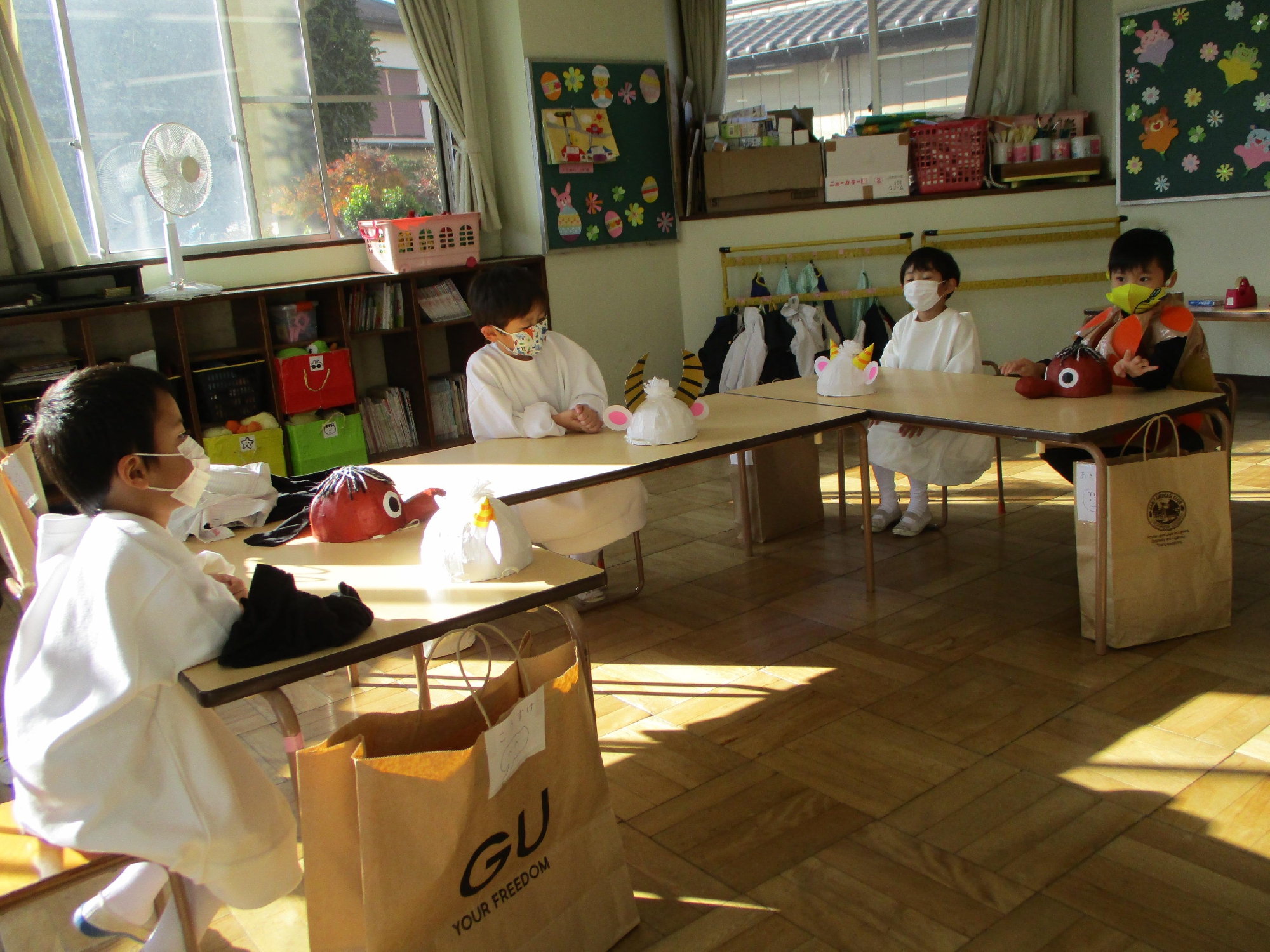 今日は、生活発表会の予行練習がありました。本番と同じように衣装に着替えます。上手に着替えられるかな?
