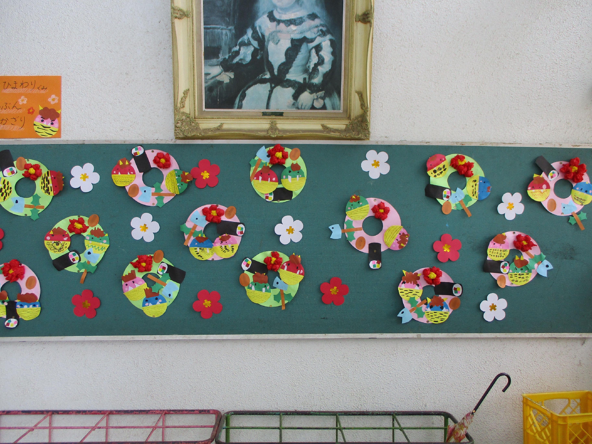 毎月、順番で玄関壁面を作ります。1月は年中組の担当です。