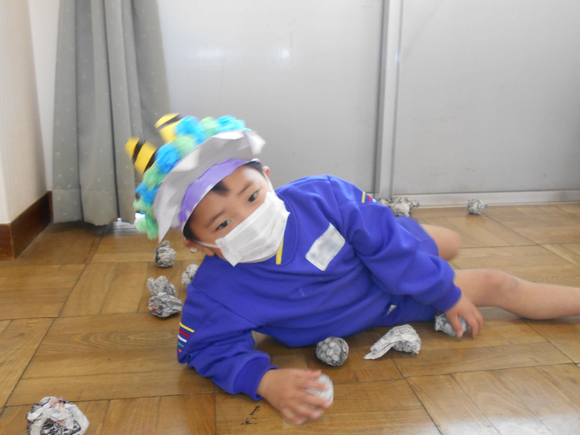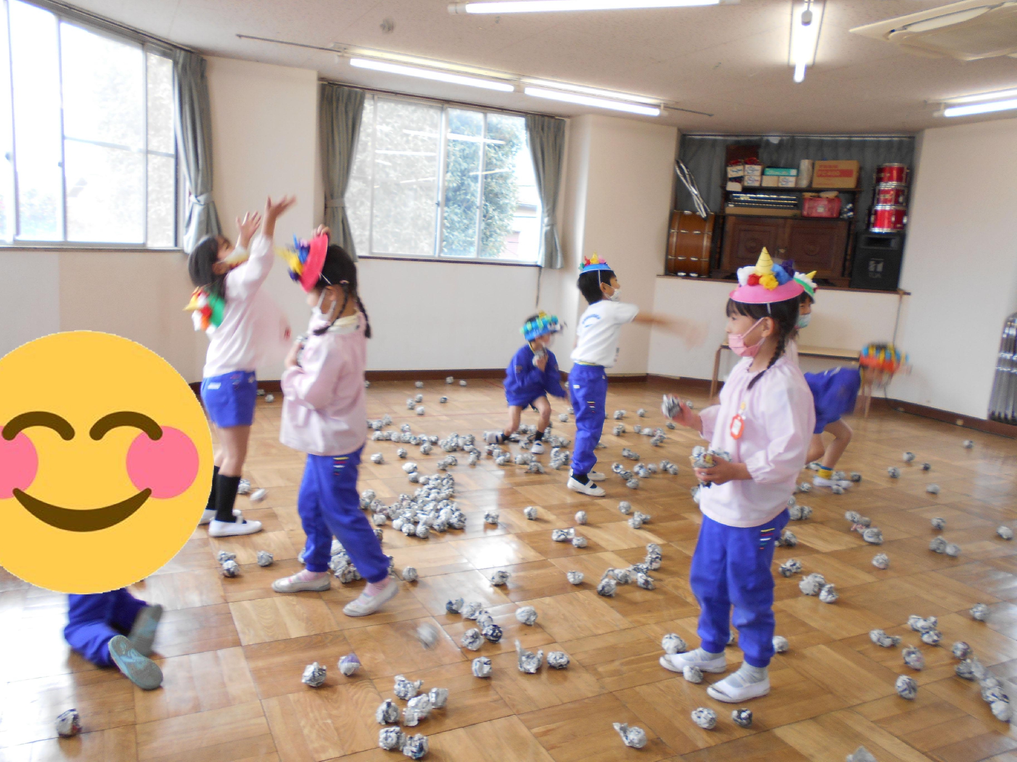 今日は節分、はじめて幼稚園での豆まきをした年少組の子ども達です。本物の鬼うち豆ではなく、新聞紙を丸めたボールをまめに見立てました。