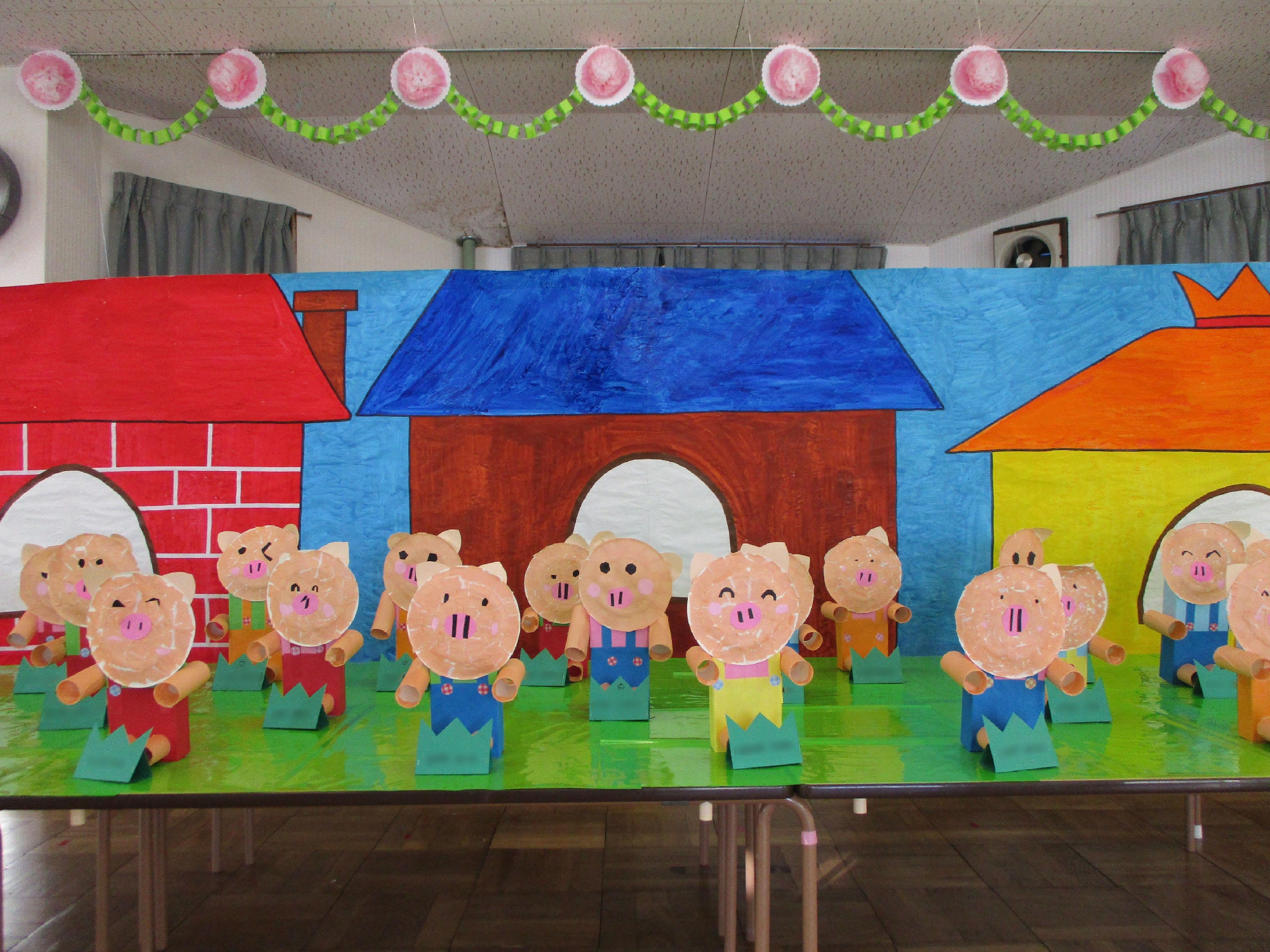 お遊戯室に全園児の立体製作を展示しました。今年のテーマは、『さんびきのこぶた』🐷です。表情に個性が出ていて、何とも可愛いい!!ですね。