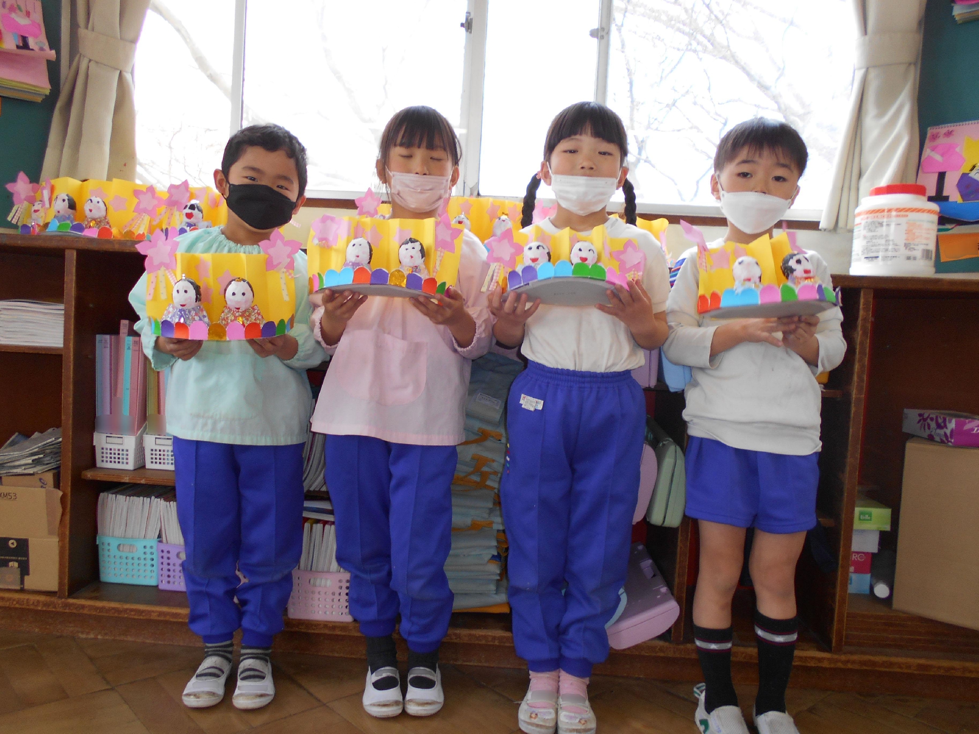 年中組のお雛様です。色とりどりの丸いひな壇に座っている、お内裏様とお雛様がとっても可愛らしく、にっこり笑ったお顔が微笑ましいお雛様が出来上がりました。細かい製作も上手にこなせるようになりました!!成長・成長です。