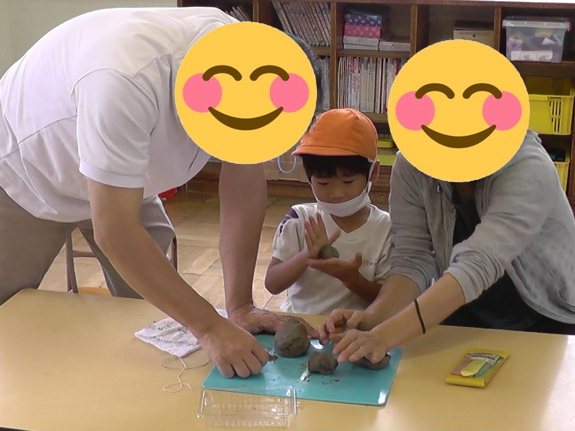 お父さん、お母さんと一緒に一生懸命に粘土をこねます。力をこめたり細かい細工をしたり、大人の力も合わせて子どもたちとの共同の作品ができ上がりました。