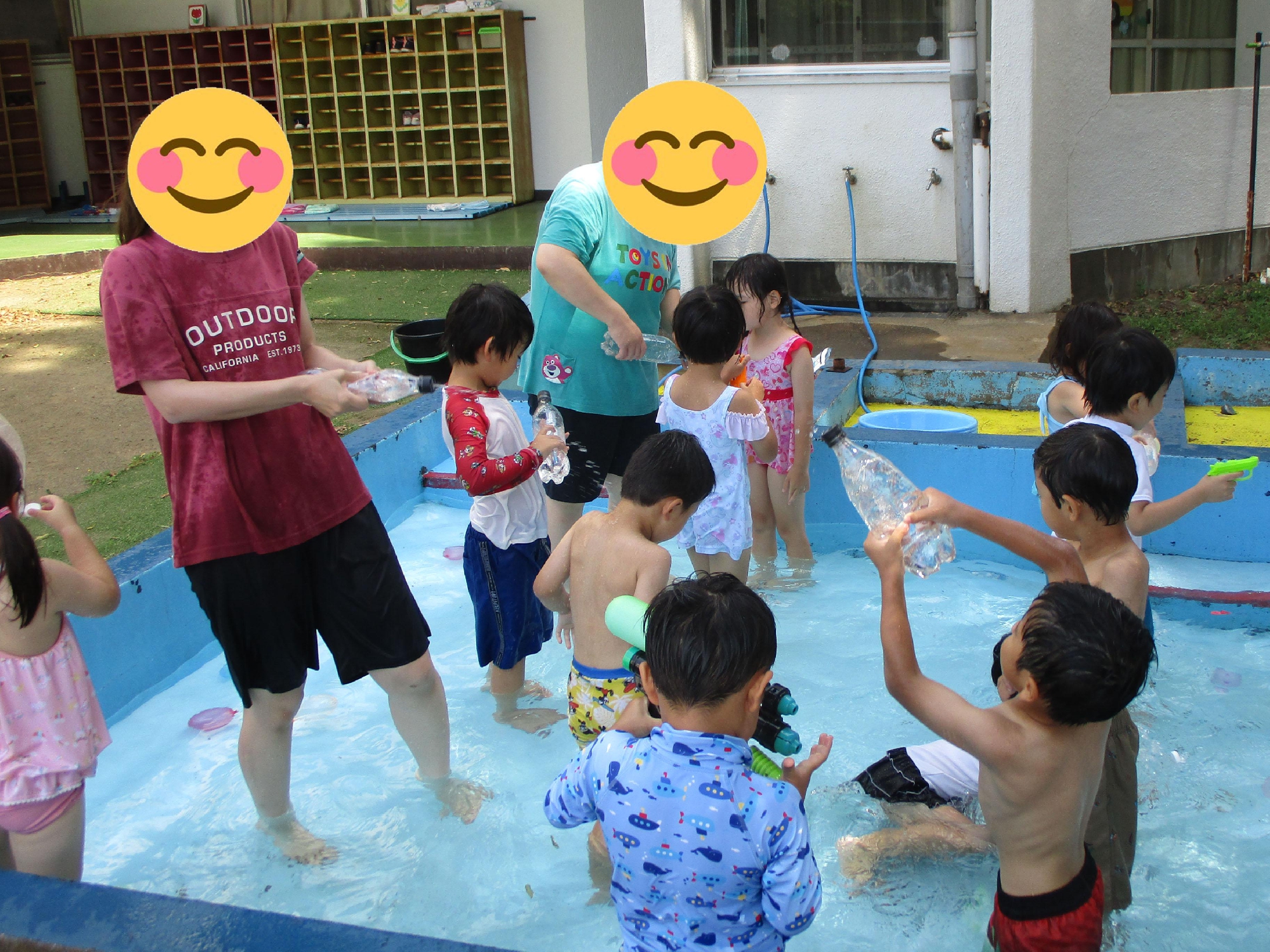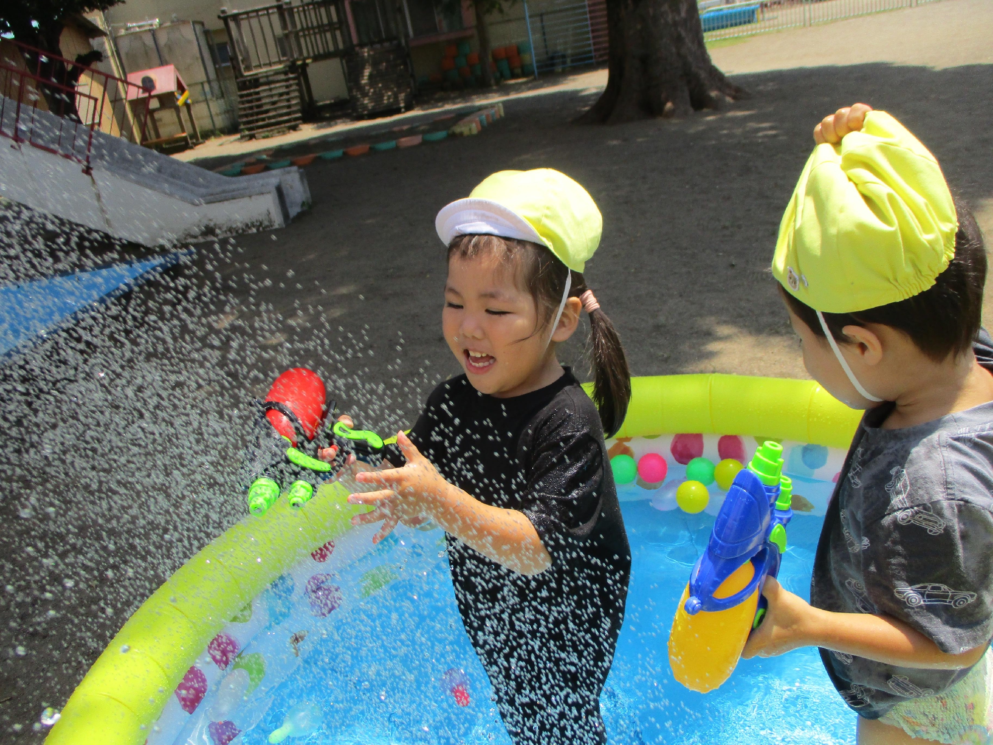 水鉄砲を構えて水をかけ合っています。お友だちと一緒に入るプールは楽しさもいっぱいですね。