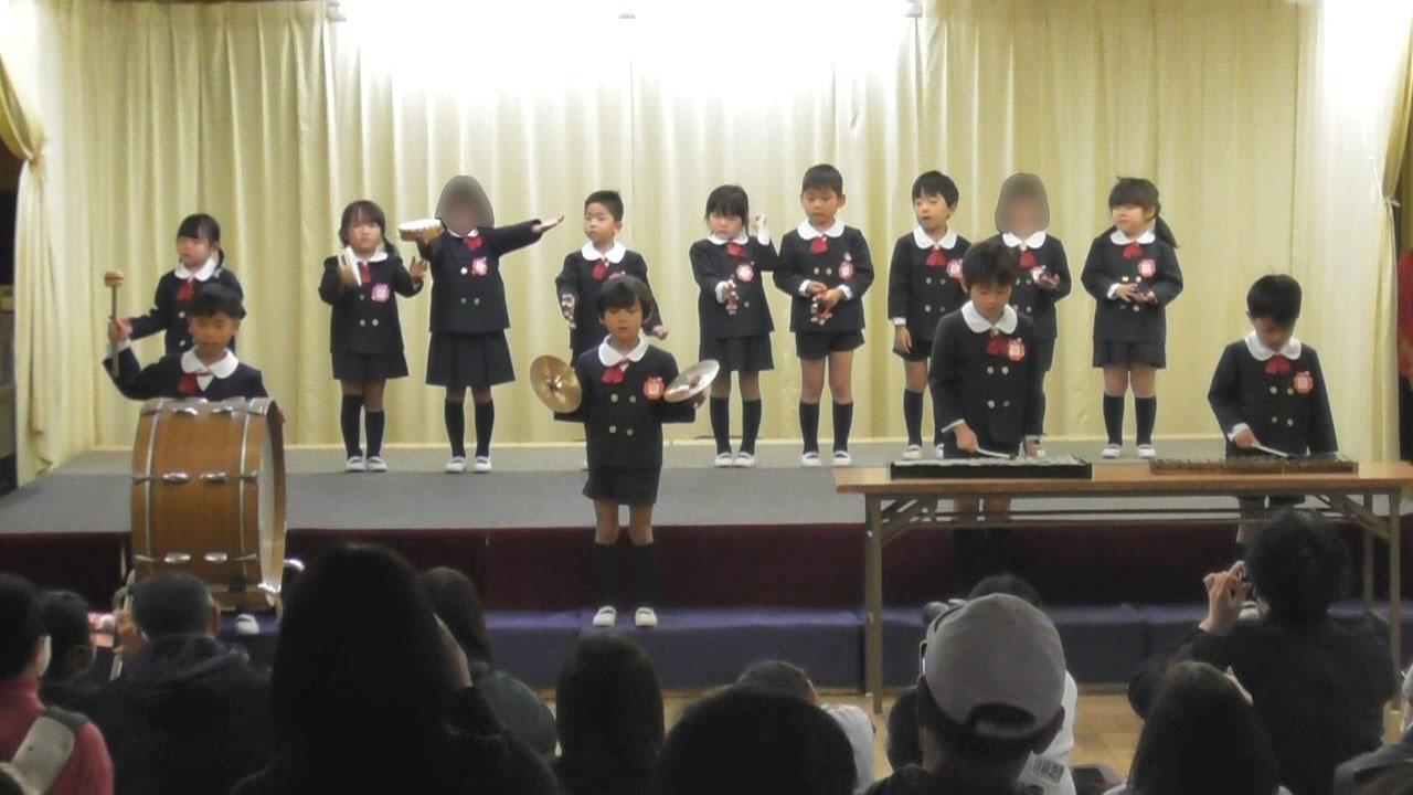 年中・年長組の合同合奏です。みんなの息を合わせることで、多くの楽器のメロディーがひとつになって、とても迫力のある曲が演奏できました。