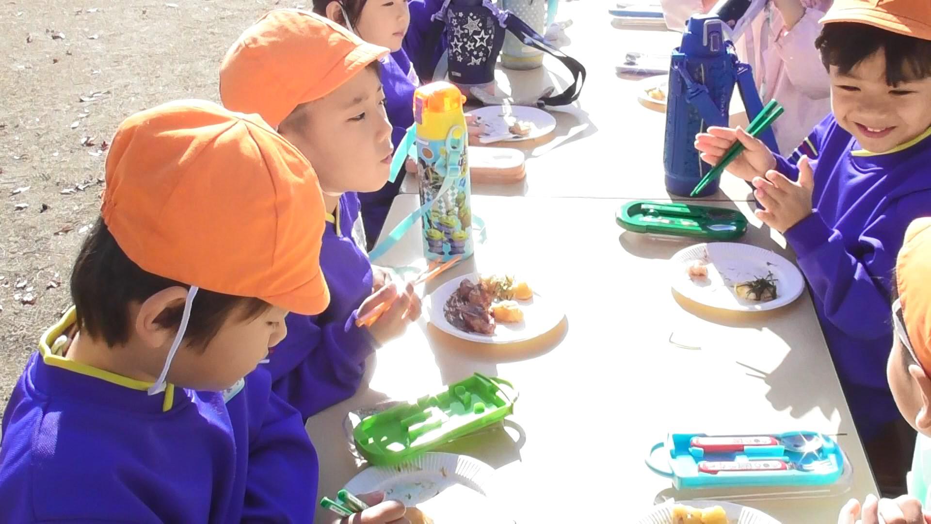 お日様の下で、みんなと一緒に食べるおもちはとってもおいしい!今年一年、元気いっぱいに幼稚園で遊ぶことができました。来年もみんな一緒に遊ぼうね。