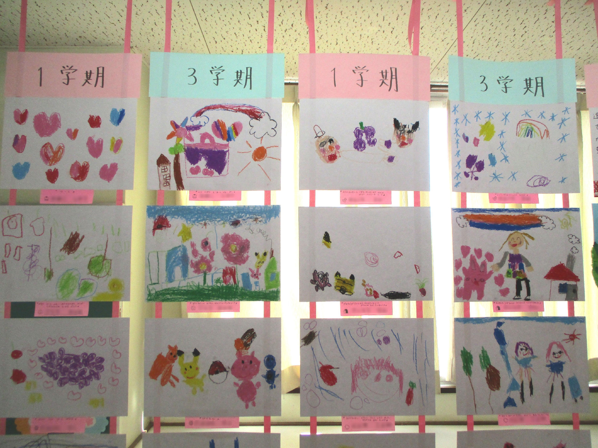 年中組の『自由画』です。一学期に描いたものと三学期に描いたものが並べて展示してあります。春にはまだあどけなかった絵が、色をすみずみまで塗れるようになったり、線も力強く引けるようになったりと、一年間の成長を感じられる作品になりました。