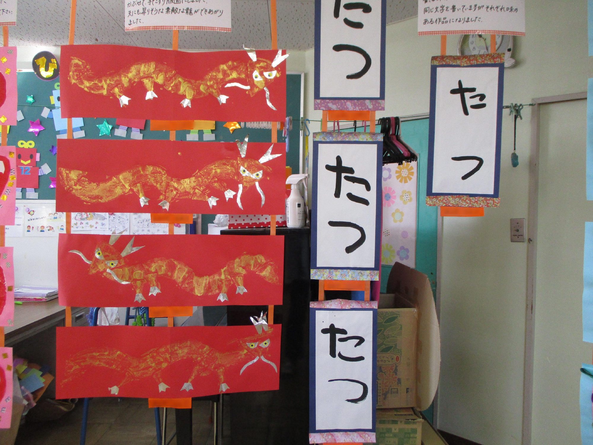 年長組の辰(たつ)の版画です。厚紙を使って顔や体を作り、金色の絵の具を塗って版画にしました。固い厚紙をはさみで切るのは大変でしたが、頑張って作った龍は今にも飛び出て天に昇っていきそうな迫力です。