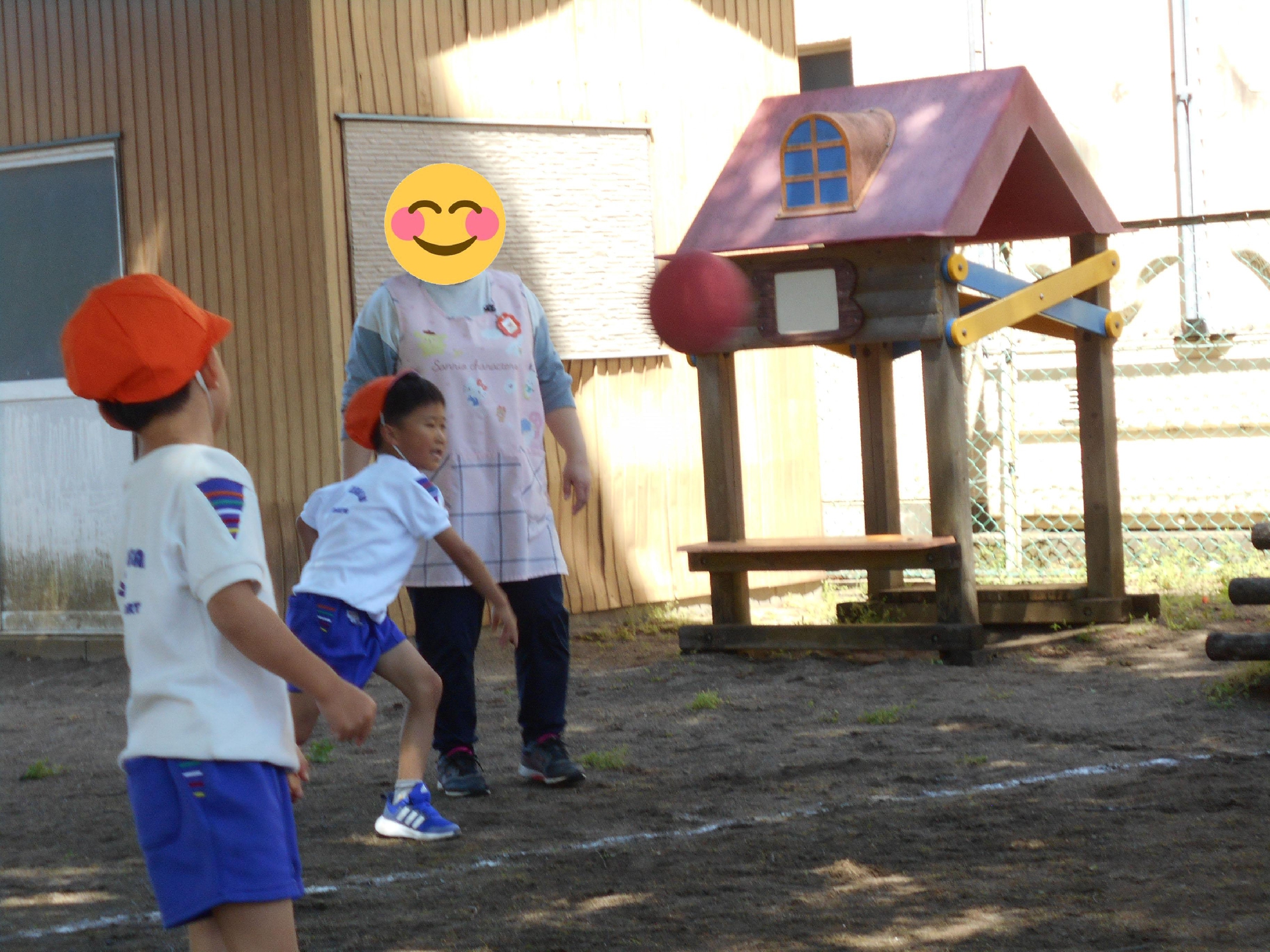 大きくなった年長組の子どもたち、ボールの投げ方も力強く、片手でしっかり投げられるよう練習しています。