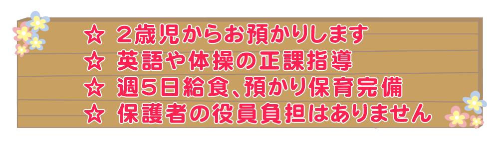 | 保育時間 | 平日(月~金) 8時30分~9時登園 / 14時0分降園 第三水曜日 8時30分~9時登園 / 11時00分降園 |