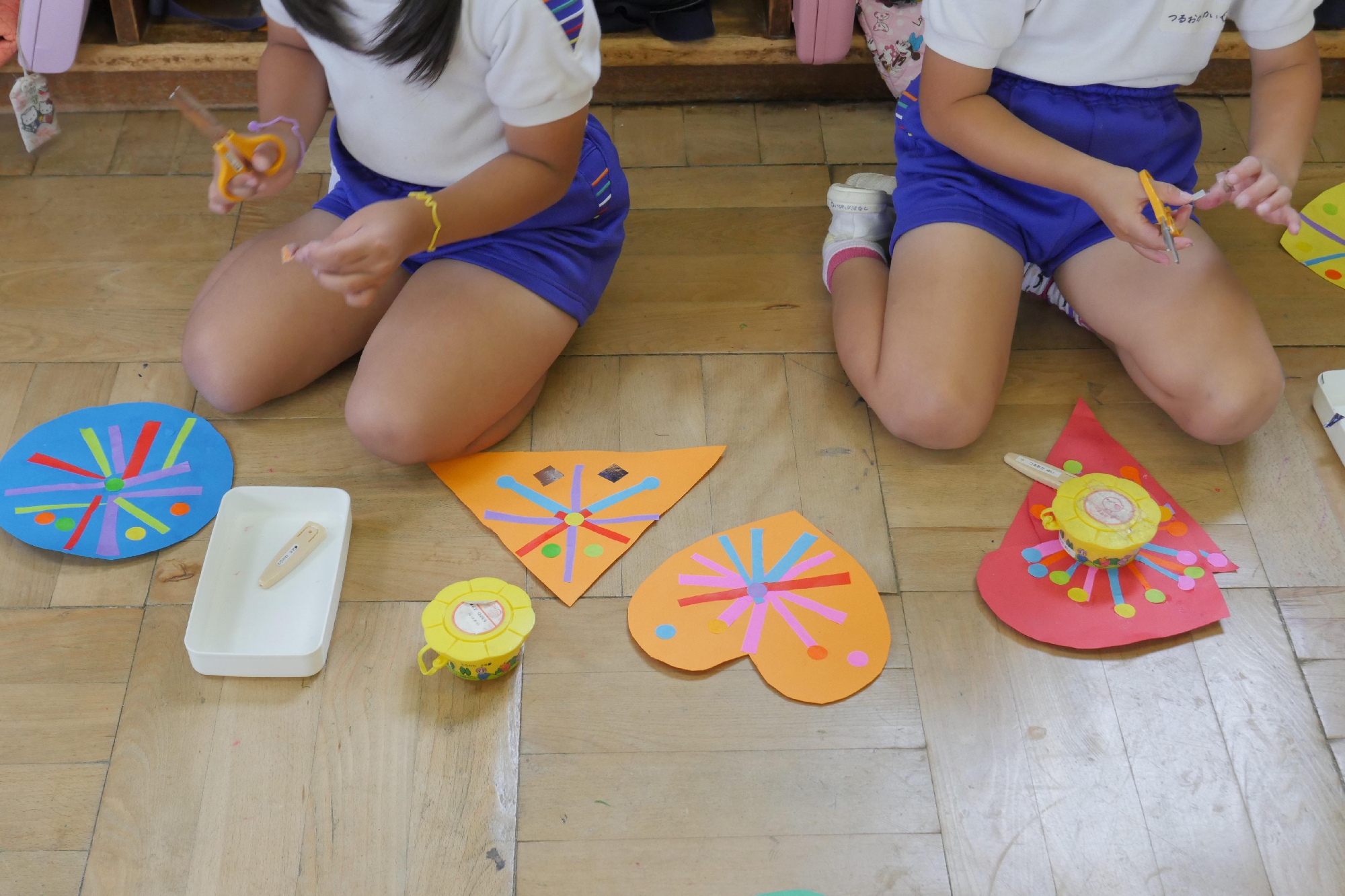 決まりきった玩具を使ったり、点線に沿って折ったり、貼ったり、切ったりした作品を作るのではなく、多少いびつでも子どもが円を描いて、それを切りぬいたり、星を書いてそれに色を塗ったり、和紙を染めてから折り紙にしたりと、子どもの手と頭をたっぷりと使った造形活動から、既成のものを越える想像力や創造性を育てています。