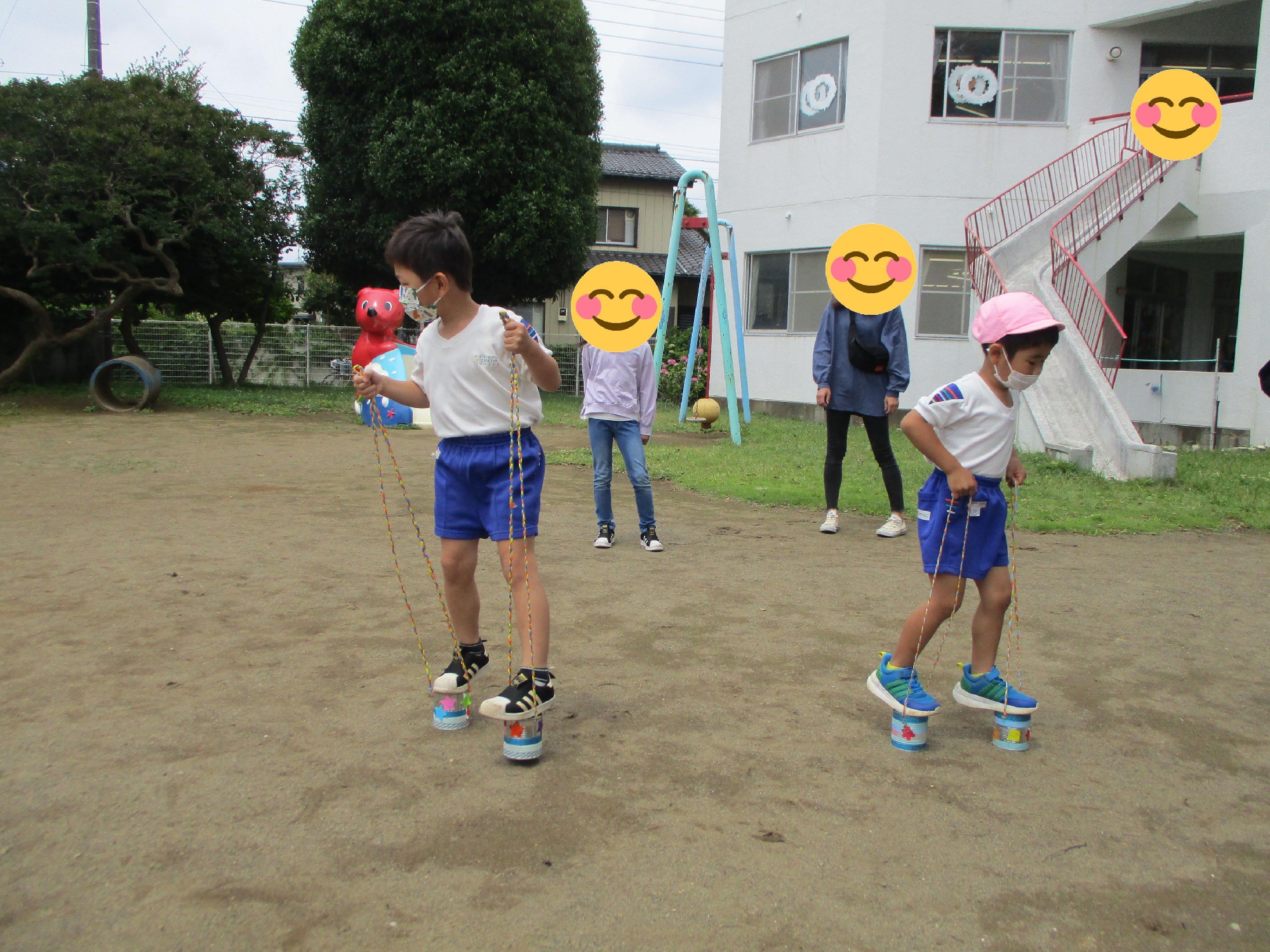 出来上がった❝缶ぽっくり❞で、いよいよお外で遊びます。