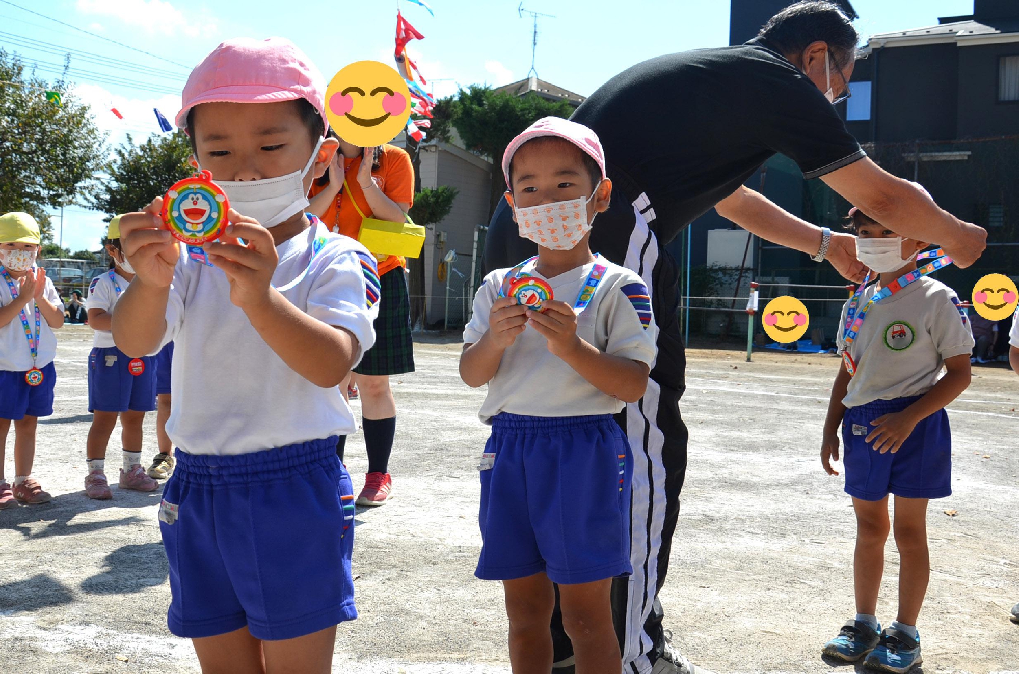 運動会の閉会式にて、園長先生から、ごほうびメダルを頂きました!!