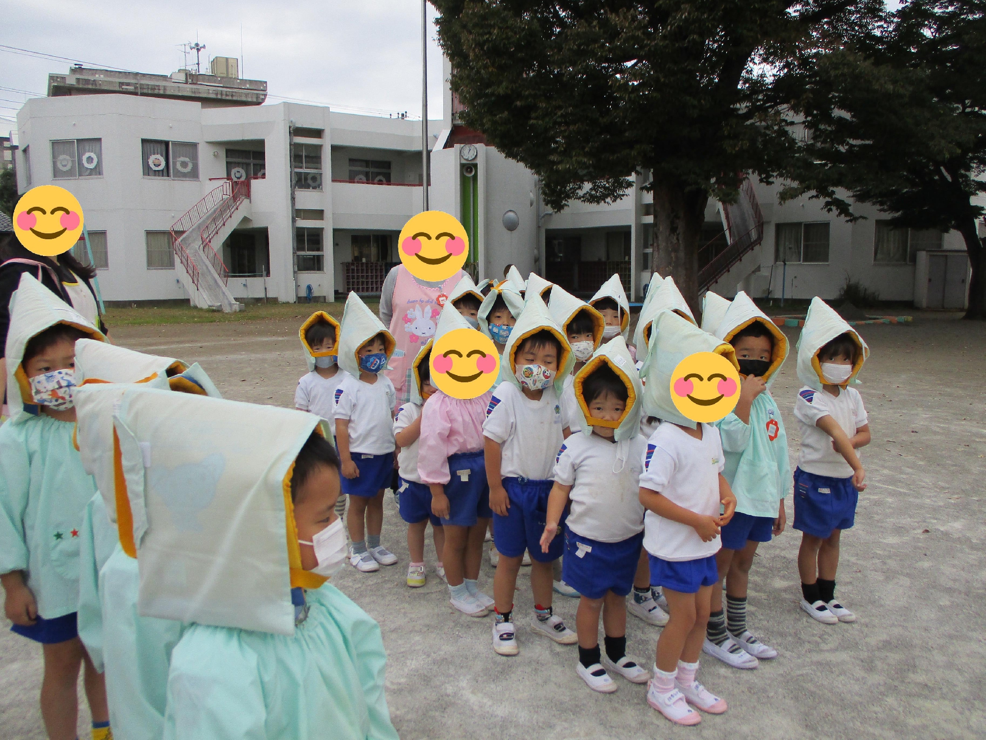 防災頭巾を被り、煙を吸わないように口を手で覆います。