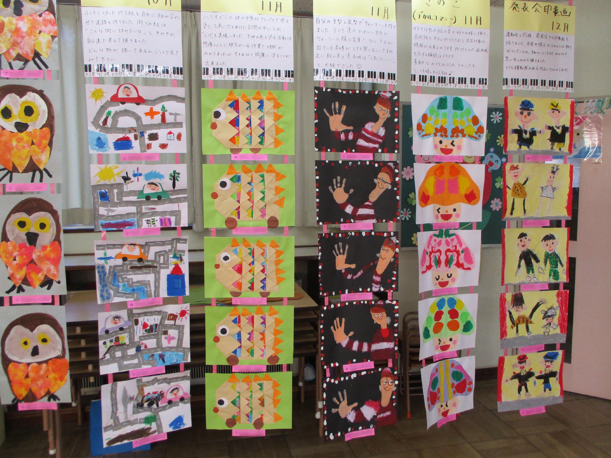 年少組です。可愛らしい作品が沢山出来ました。年少さんらしい、何とも言えない個性が出ていますね!!