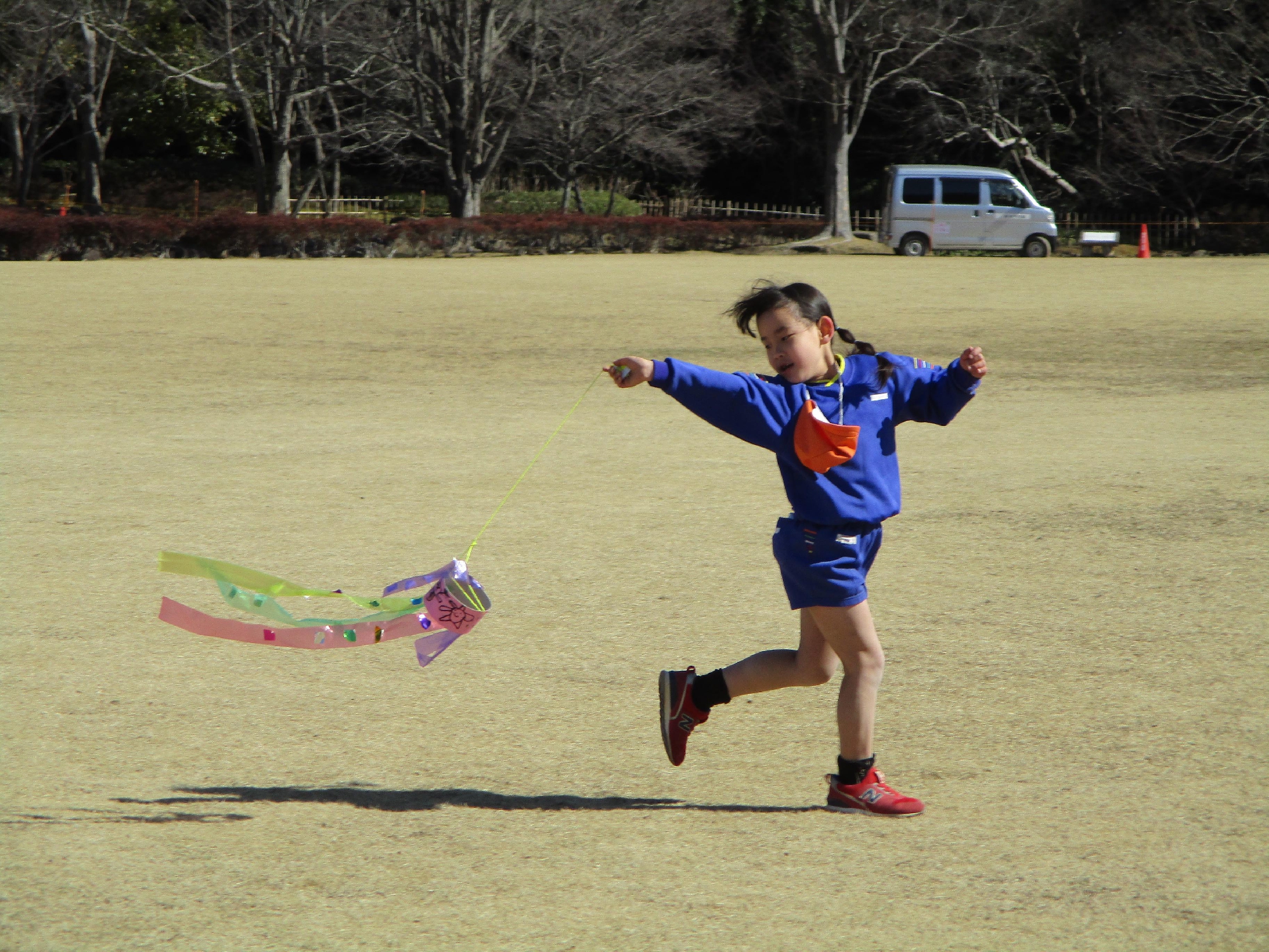 自分たちで作ったお手製の『凧』を広場で飛ばして遊びました!! 全速力で走って、風を切って飛ばしています!!『いいよ~!走って、走って!!』はぁ~、はぁ~言いながらも子ども達、とっても楽しそうですね。