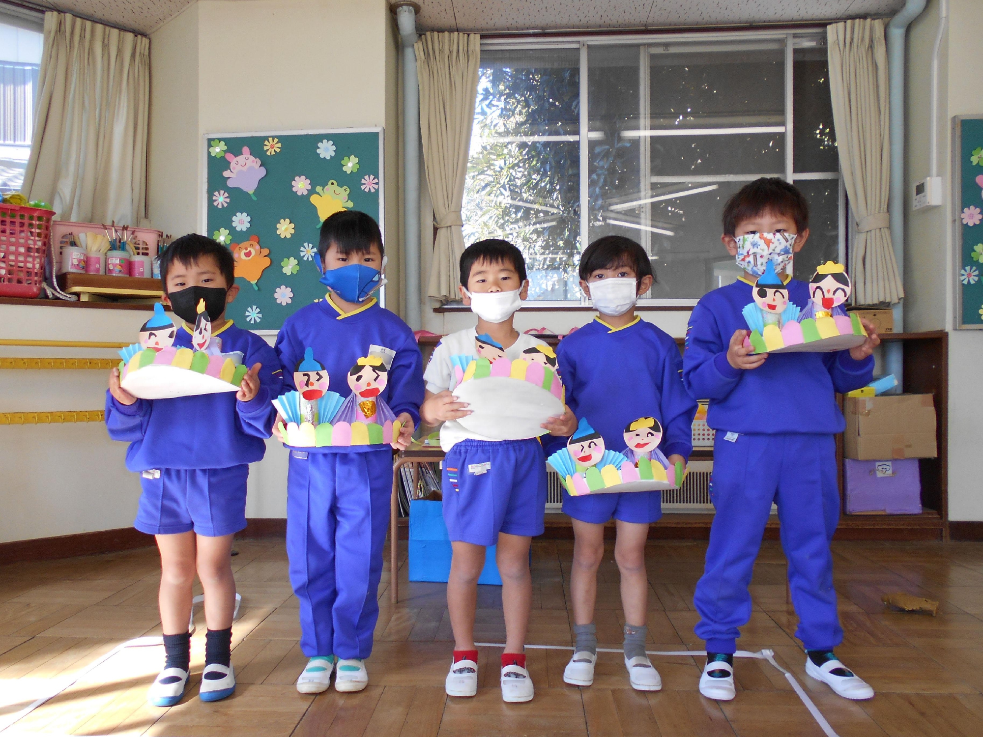 年中組のお雛様です。色とりどりの丸いひな壇に座っている、お内裏様とお雛様がとっても可愛らしく、にっこり笑ったお顔が微笑ましいお雛様が出来上がりました。細かい製作も上手にこなせるようになりました!!成長・成長です。