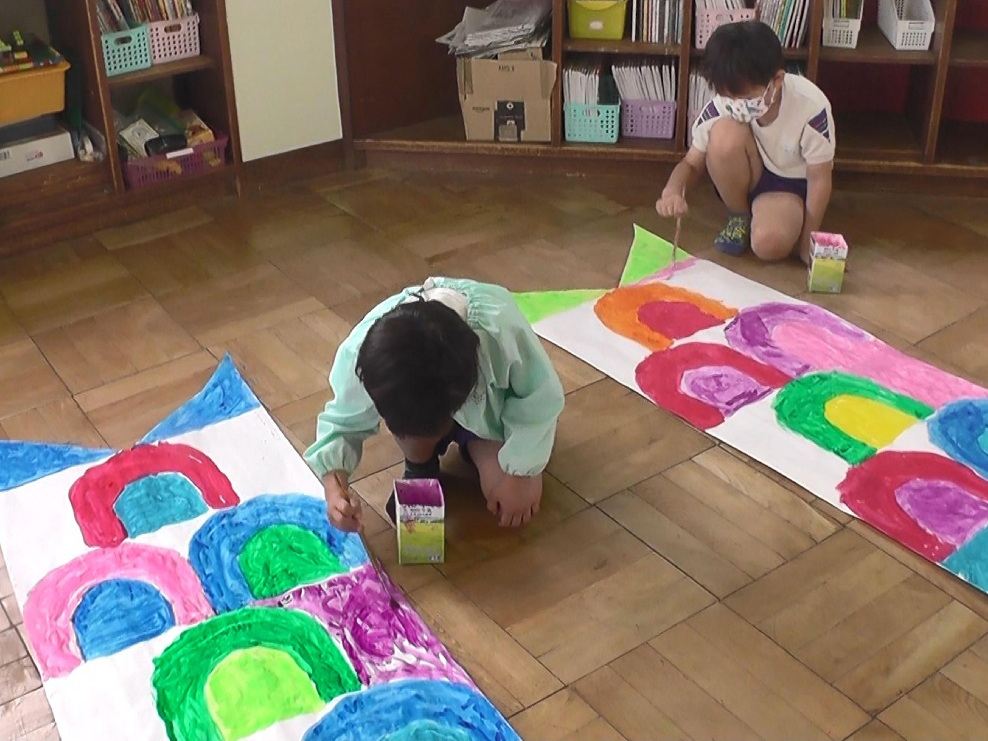 年長さんは、自分の体よりも大きなこいのぼりを作っています。大きな紙に絵の具を使って一生懸命に色を塗っています。お父さん、お母さんたちも見に来てくれるこどもまつりの日の空を、こいのぼりは大きく力強く泳ぎます。