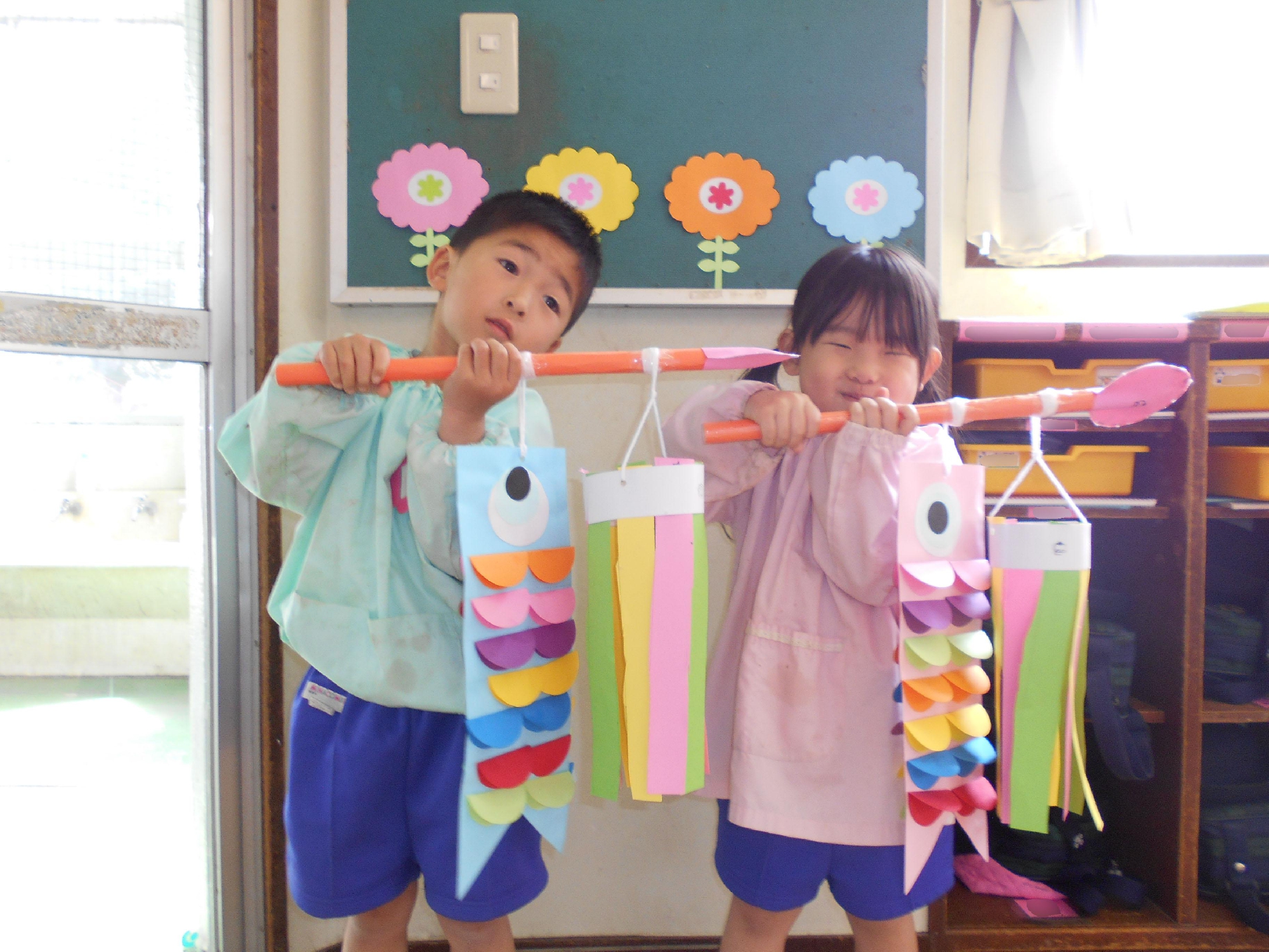 年中さんのこいのぼりは、はさみを使って紙を切り、のりをつけて、いっぱい製作をがんばりました。大きくなれるようにと願いを込めて風にたなびくこいのぼりです。