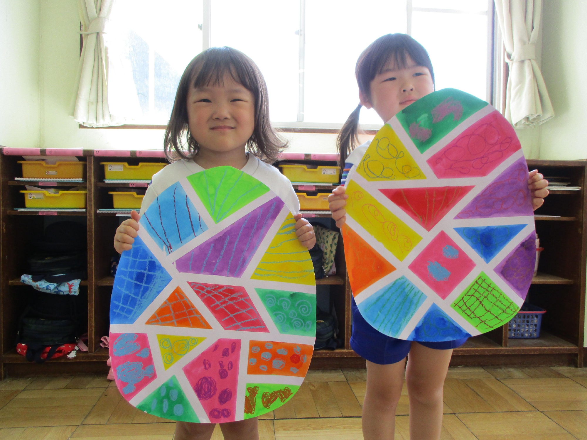 今日の製作は色塗りのお稽古です。大きなたまごをキャンバスにして、絵の具で色を塗り、クレパスで自由に模様を描きます。色とりどりの作品を形にする経験を通して、筆やクレパスの持ち方・使い方を身に付けていきます。