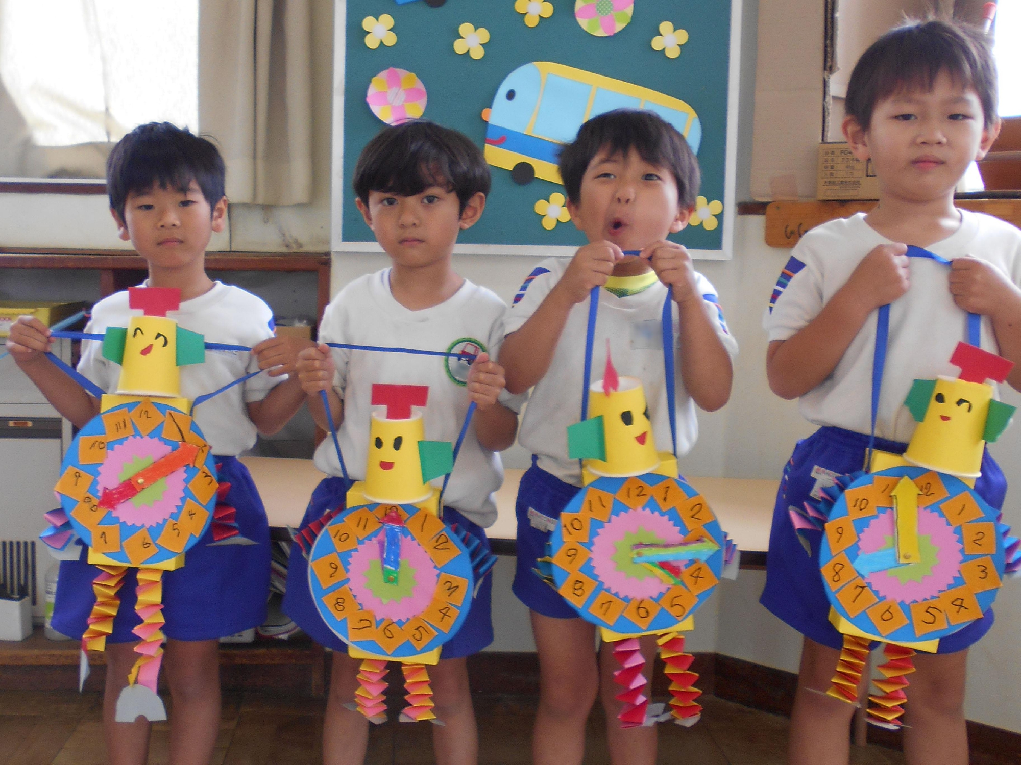 時の記念日に合わせた時計の製作です。ロボットの目や口や頭などいろんなパーツを切り出して、蛇腹折りで作った手足を付けて、文字盤の数字も自分で書きました。ひとつひとつ丁寧に組み上げて完成した、自慢のロボット時計になりました。