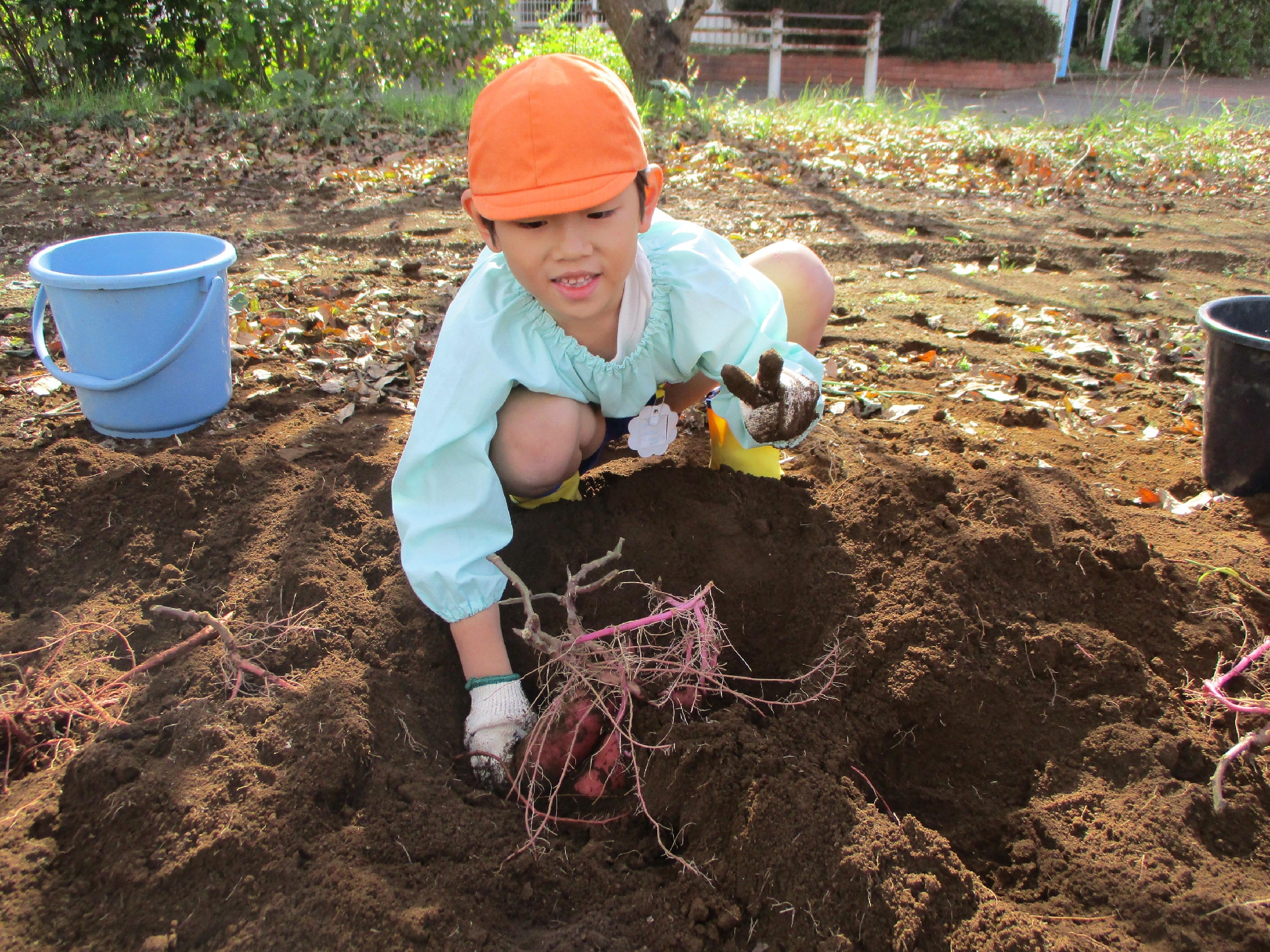年長さんがお芋ほりに挑戦です。長靴を履いて軍手を付けて用意は万全。力をこめて土を掘り起こします。
