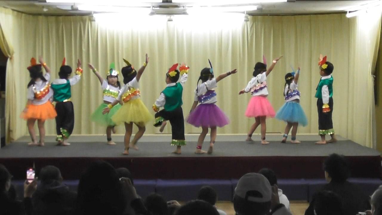 全学年合同のおゆうぎです。年少さんにとっては初めての発表会。大きく腕を振って一生懸命に踊っています。