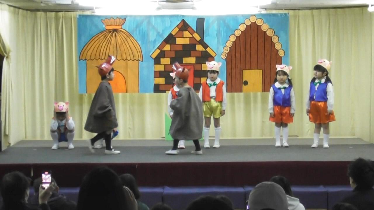 年中組のオペレッタです。音楽に合わせて体を動かし、全身を使って物語を演じていきます。登場人物になりきった可愛らしい衣装も注目です。
