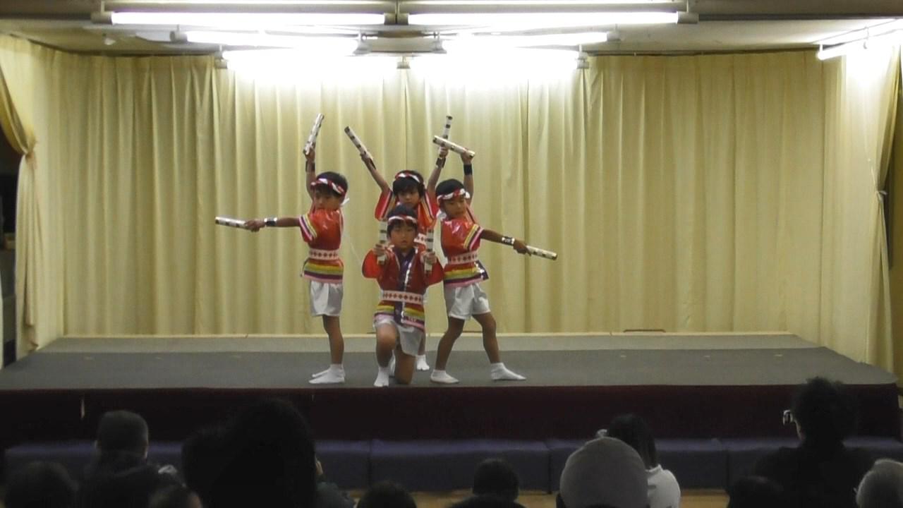年長組のおゆうぎです。お祭り衣装も華やかに、バチを使ってダイナミックに踊ります。お父さんお母さんの前で年長組の格好良さをたくさん見せてくれました。