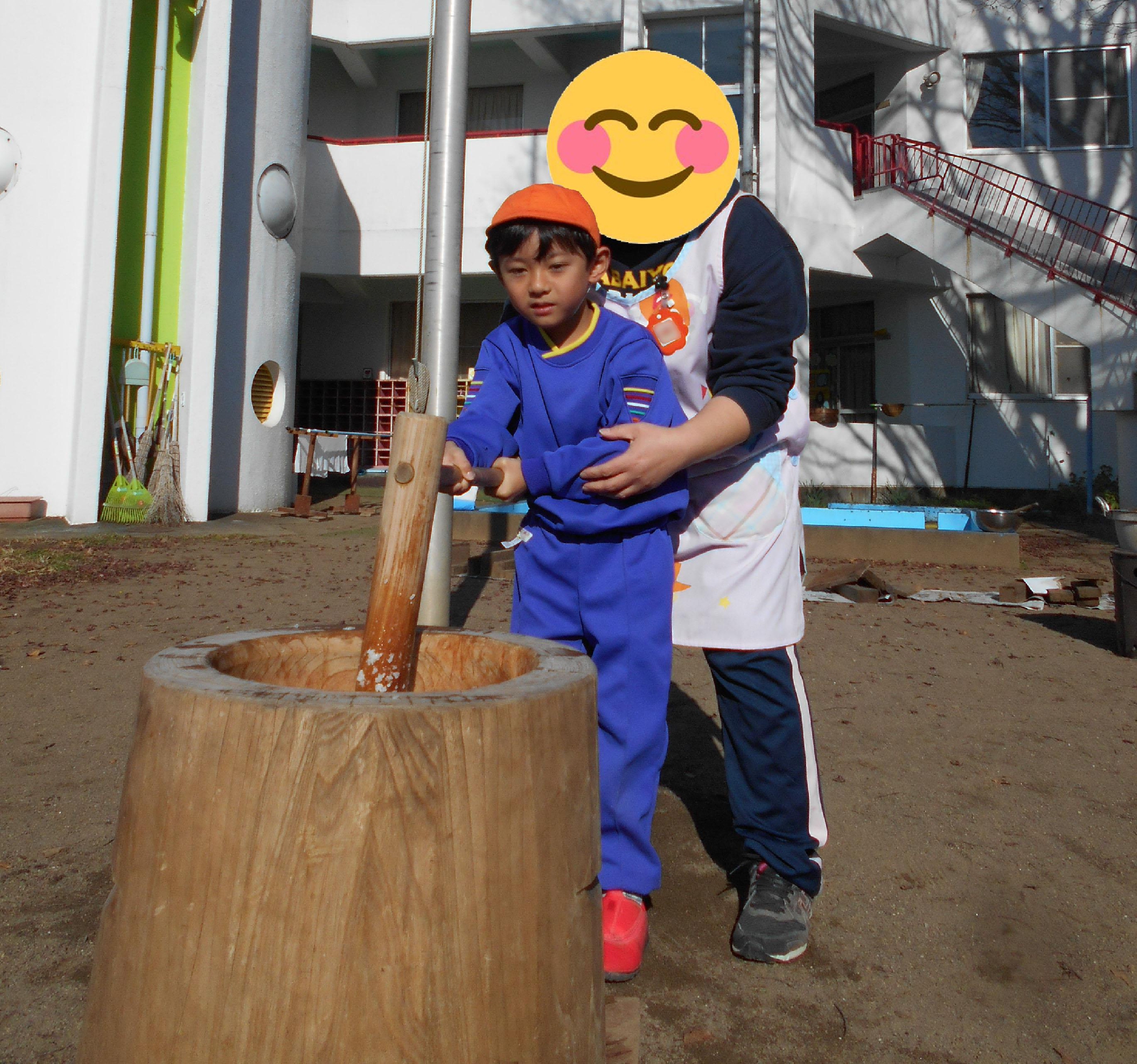 子どもたちもおもちつきにチャレンジ!先生と一緒に杵を持って、力を込めておもちをつきました。
