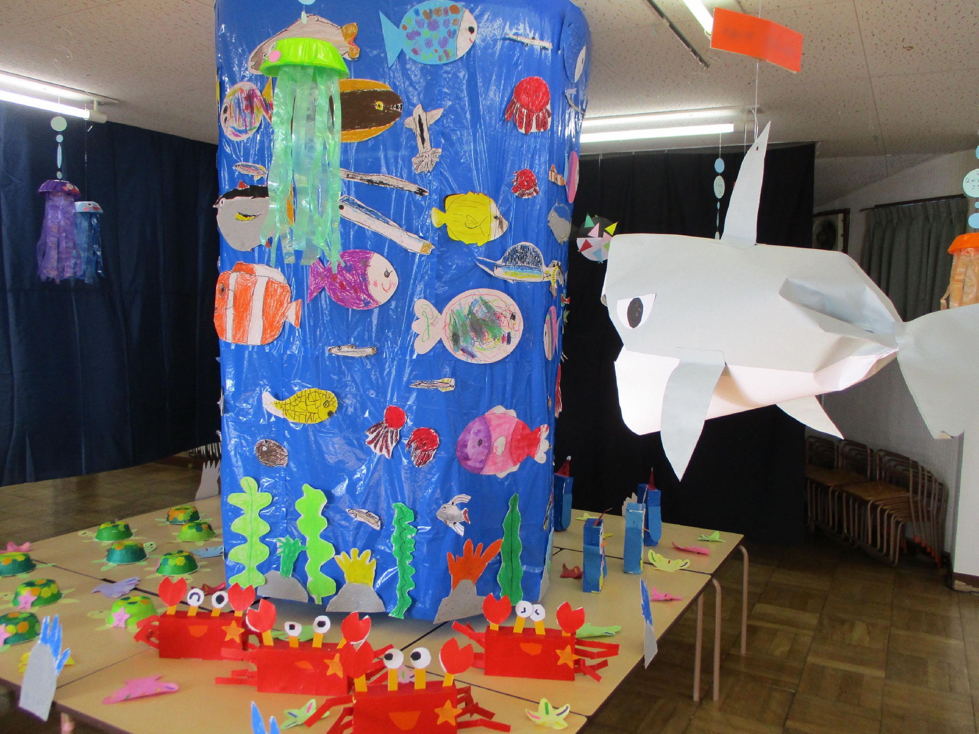 ゆうぎ室には全園児の製作が一緒に飾られています。天井まで届いた大きな柱に、みんなの作った色とりどりの魚が『すいぞくかん』を華やかに演出してくれます。